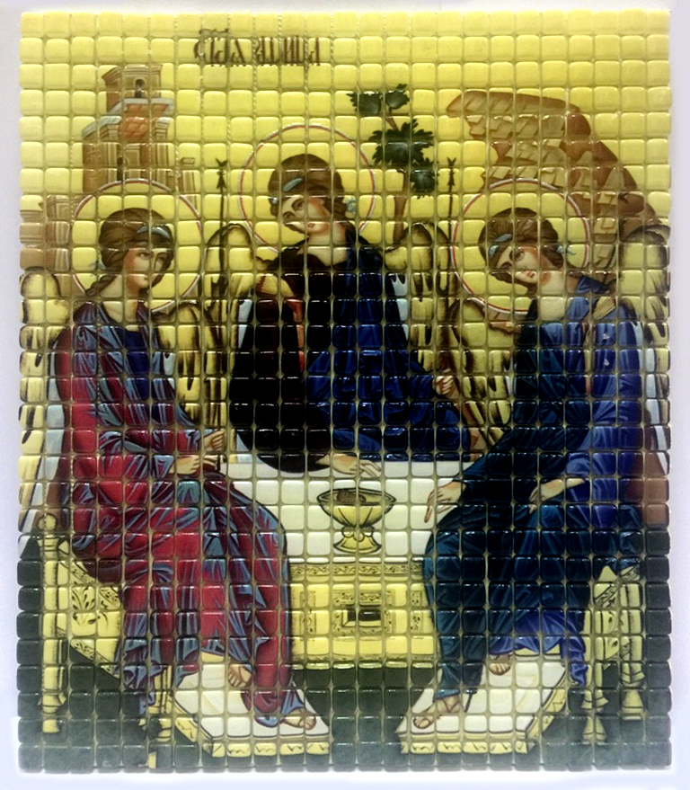 Компания «ММ Мастер Мозаик» приступила к изготовлению из стеклянной мозаики способом уф печать мозаичные Иконы. Иконы изготавливаются из стеклянной мозаики чип 10*10 мм, 20*20 мм. Иконы наклеены на подложку ПВХ двух компонентным клеем и затерты двух компонентной затиркой. Такое изделие можно использовать не только в нутрии помещений, но и на фасаде зданий, так как при данной технологии изделие хорошо переносит атмосферные воздействия.